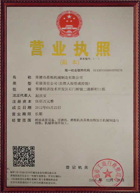 企業(yè)堅持“質量、口碑就是我們的生命”的原則,嚴格執(zhí)行質量標準檢驗體系。生產的"鼎糧"牌系列產品,產品質量優(yōu),性價比高,深受廣大新老客戶的青睞,通過了各級部門的鑒定認可,立式、臥式液壓榨油機均榮獲農機推廣證。